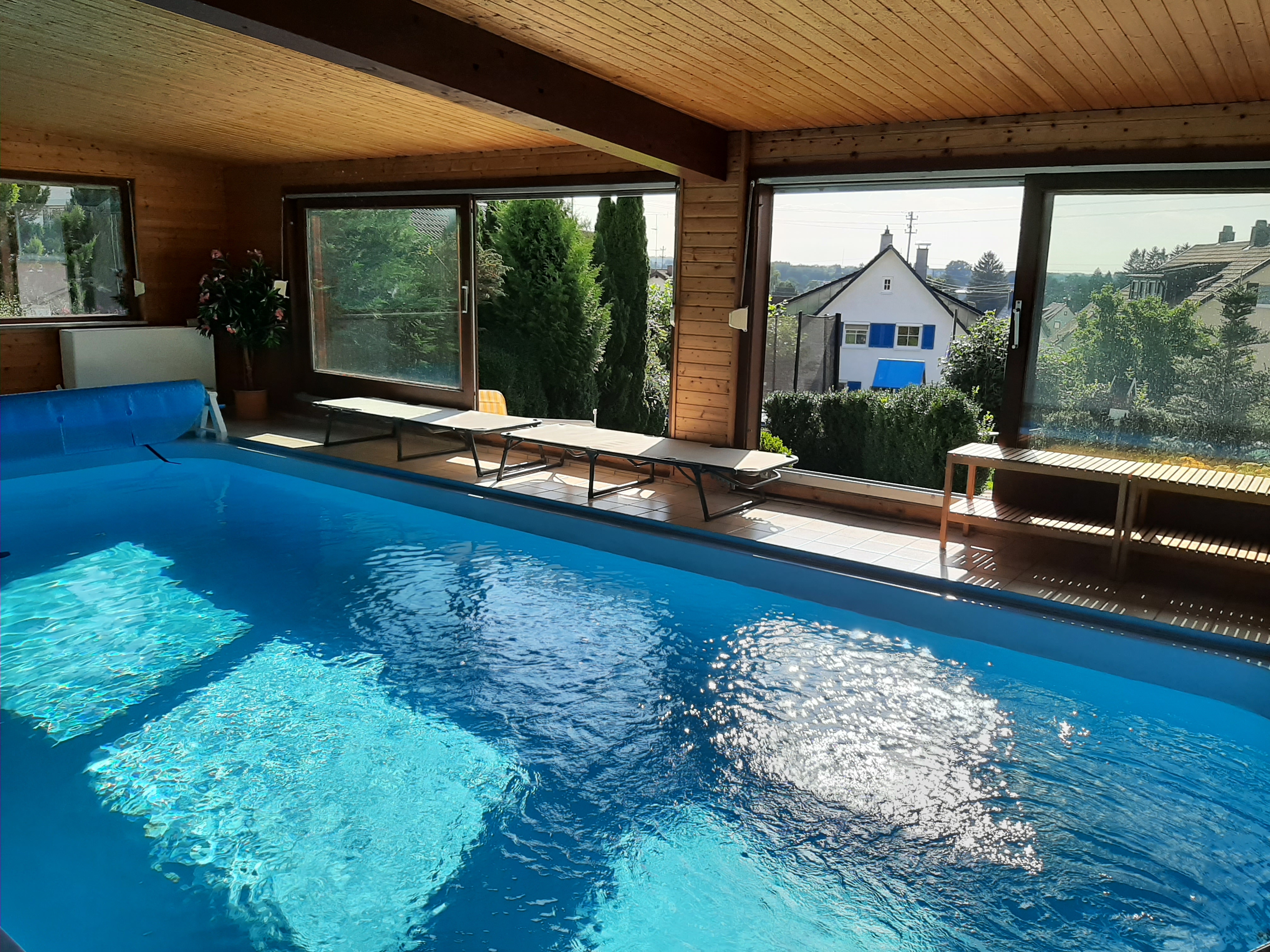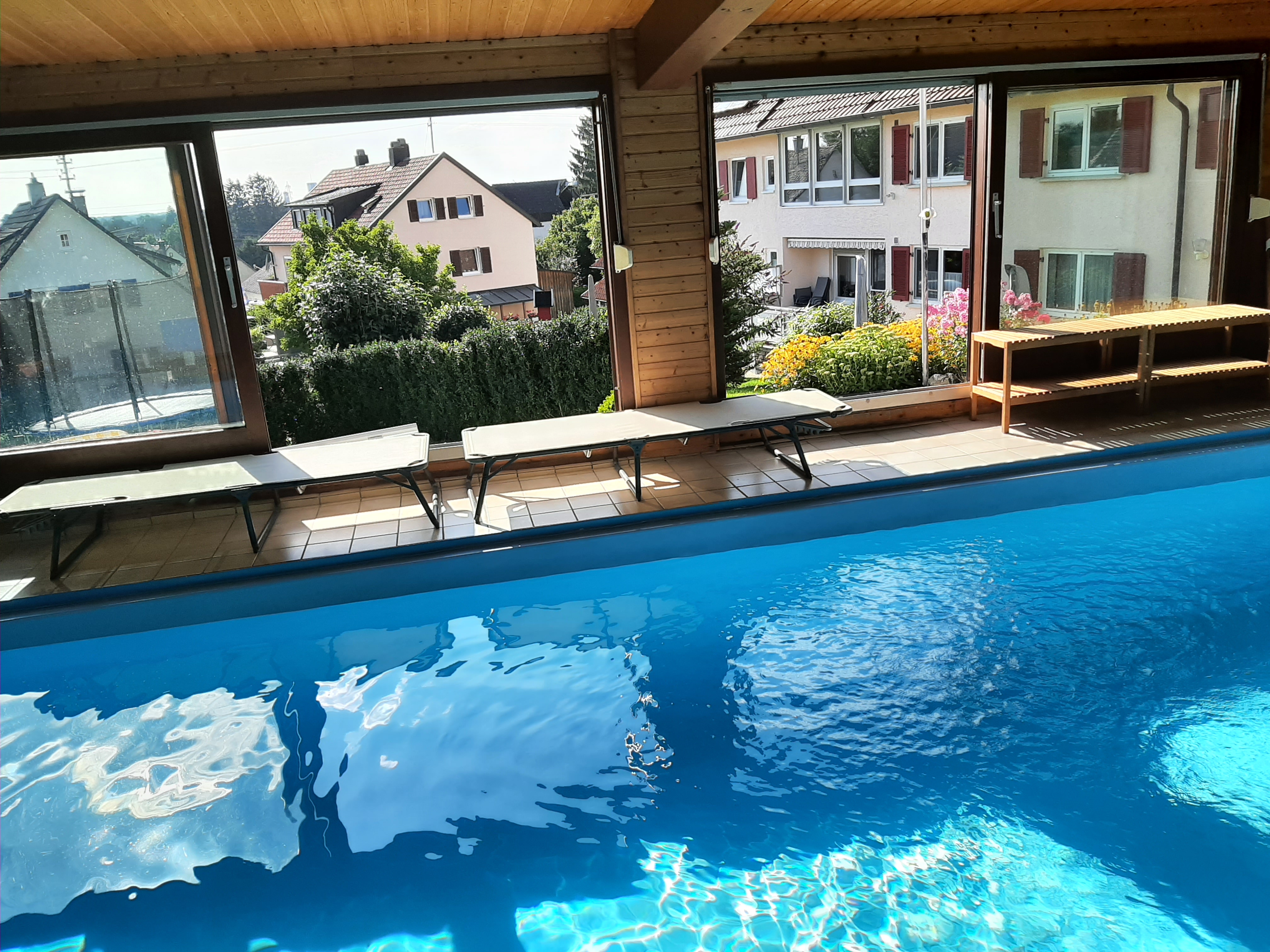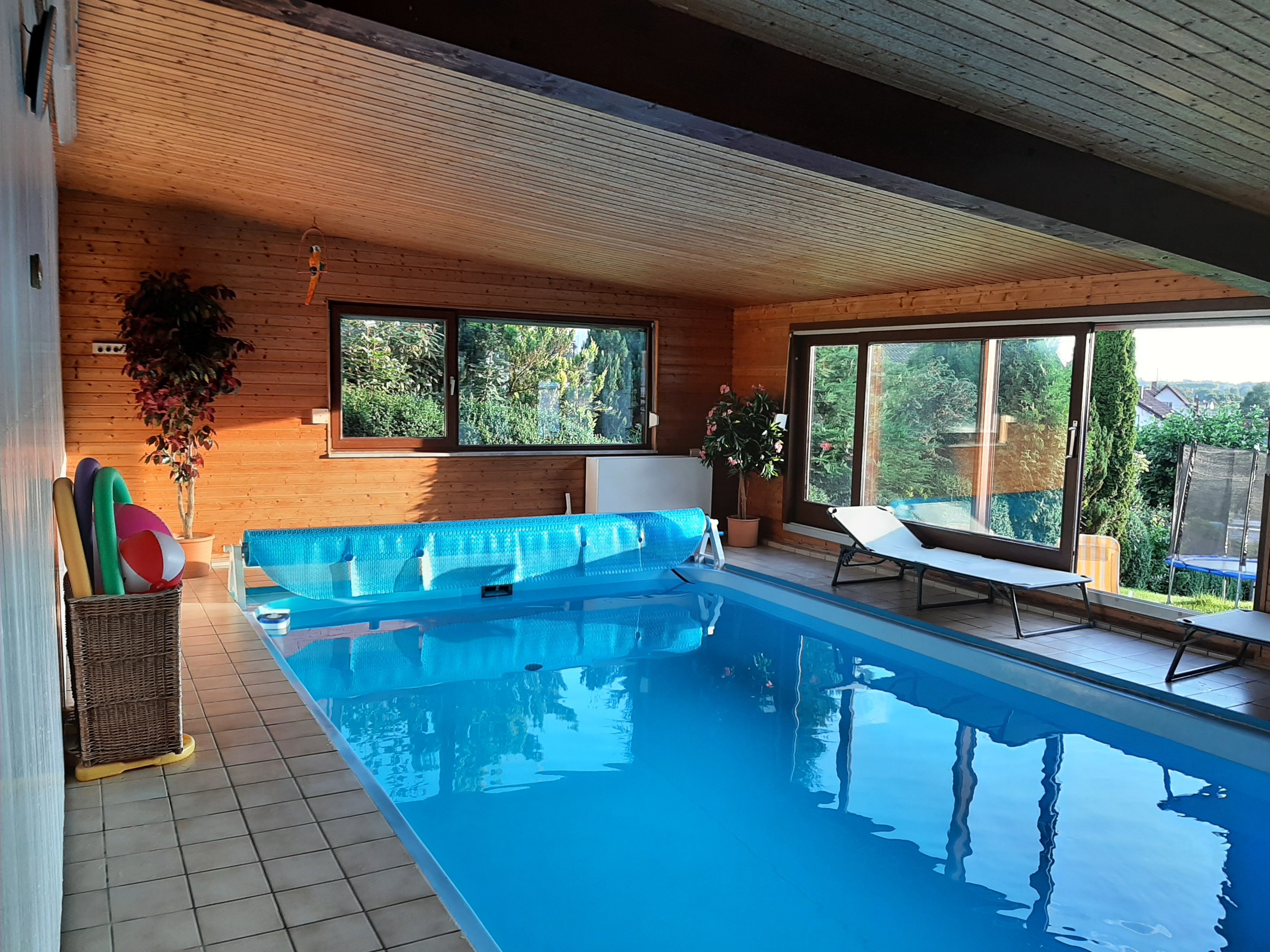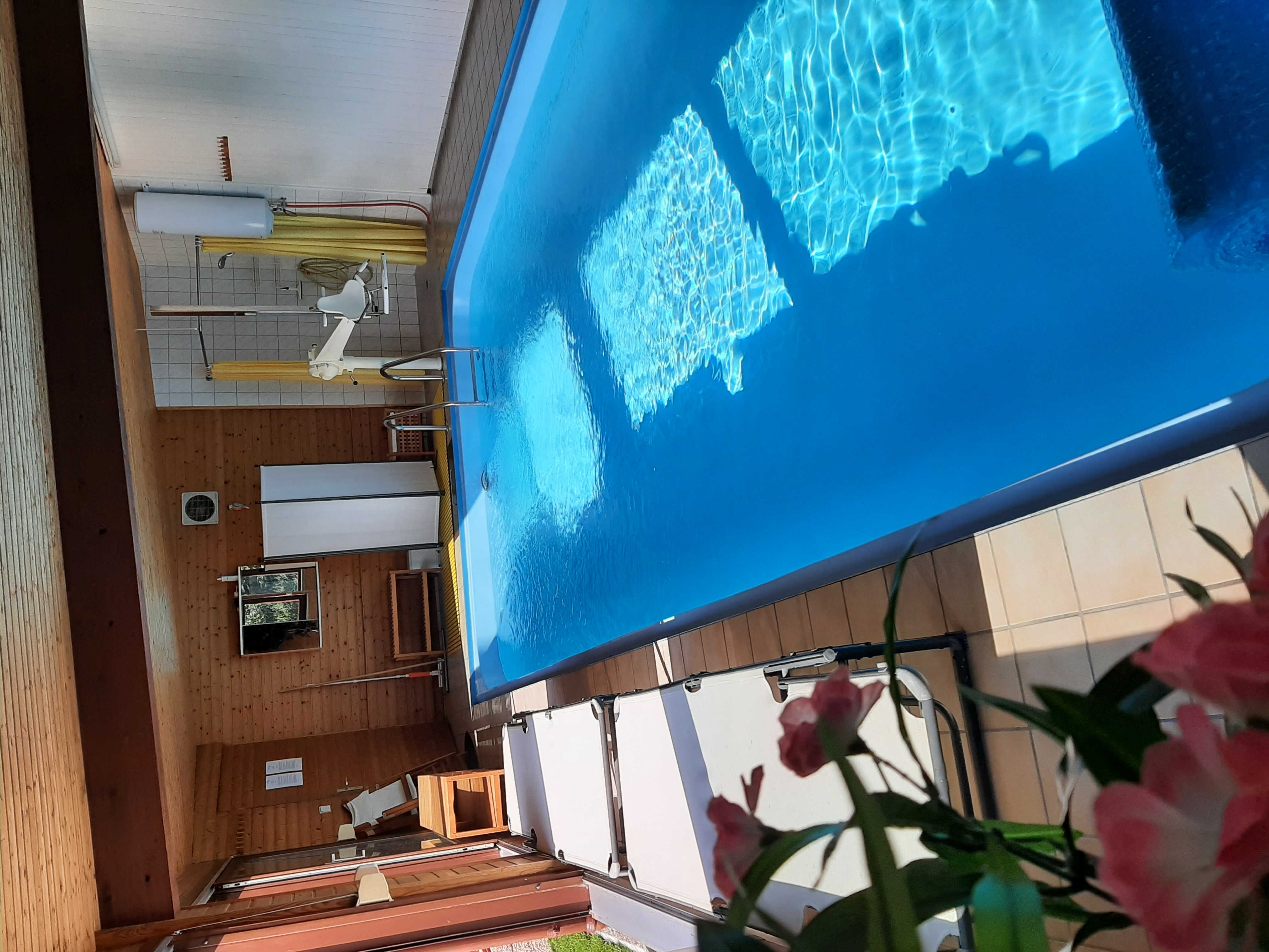 SchwimmbadUnser Indoor-Pool, von Mitte Mai bis Oktober geöffnet, ist 4 x 8 m groß und 1,30 m tief. Das Wasser im Schwimmbad hat eine durchgängige Wassertemperatur von 28°C. Schwimmnudeln und Wasserbälle vorhanden. Für die Kleinen gibt es Schwimmflügel. |